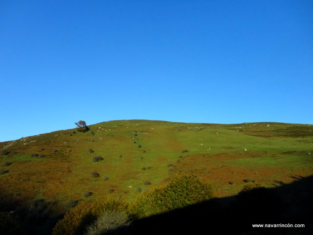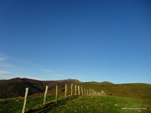 Caminaremos por esta pista sin pérdida hasta alcanzar el collado Beraskoain, desde el que podremos apreciar los montes de Iparralde. A nuestra izquierda queda Sorotepo, como una mole esmeralda bajo el cielo azul cian de otoño.