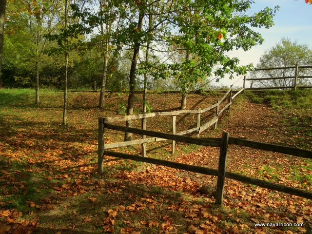 Seguimos por esta pista e ingresamos en un pequeño robledal, enseguida caminaremos por Haras de la Ultzama, 150 hectáreas de praderas preparadas para la cría de caballos Pura Sangre Inglés.